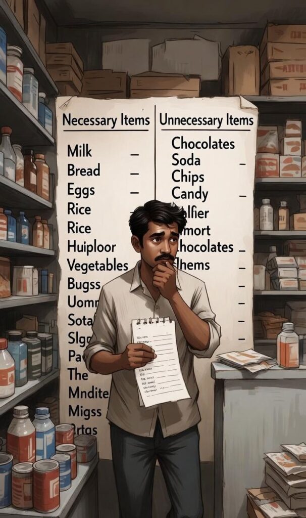 ​बिना Planning के बाज़ार जाना अपने बजट को बिगाड़ने का सबसे आसान तरीका है। जब हम बिना किसी तैयारी के Supermarket या लोकल मंडी जाते हैं, तो अक्सर “Impulsive Buying” यानी बिना सोचे-समझे खरीदारी के शिकार हो जाते हैं। रंग-बिरंगे Offers और आकर्षक Packing हमें उन चीज़ों को खरीदने पर मजबूर कर देती हैं जिनकी हमें वास्तव में ज़रूरत ही नहीं होती।