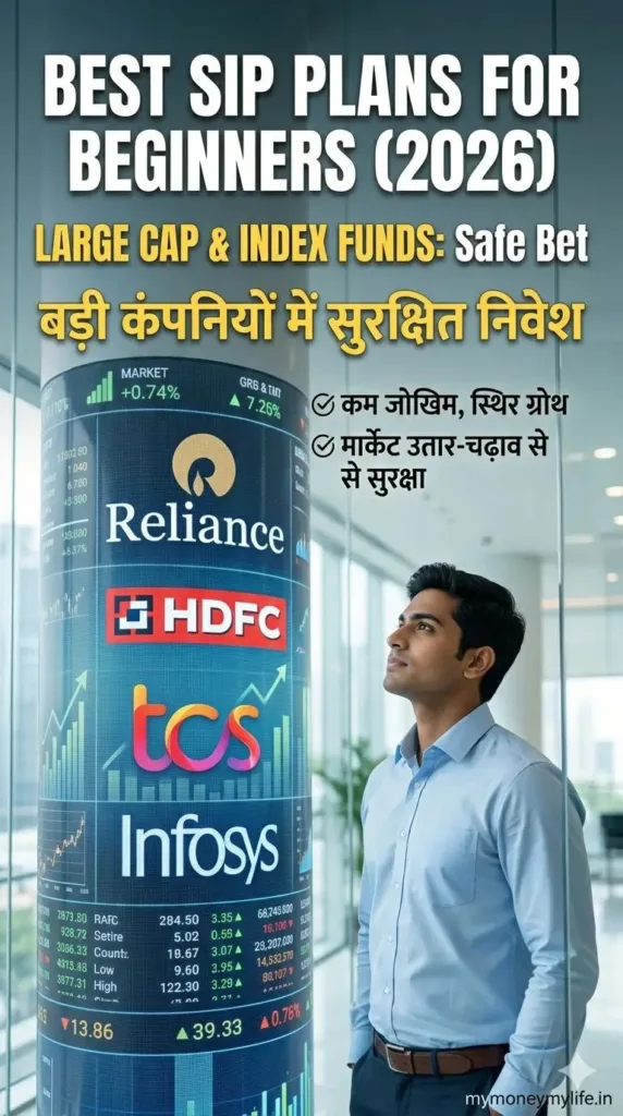 जब आप अपना पहला निवेश शुरू करते हैं, तो सबसे बड़ा डर “पैसे खोने का” होता है। इसीलिए, Best SIP Plans for Beginners की लिस्ट में मैं सबसे पहले Large Cap Funds को रखता हूँ। अगर आप बिल्कुल नए हैं, तो मेरा सुझाव हमेशा यही रहता है कि पहले कदम के रूप में आप Large Cap से ही शुरुआत करें।