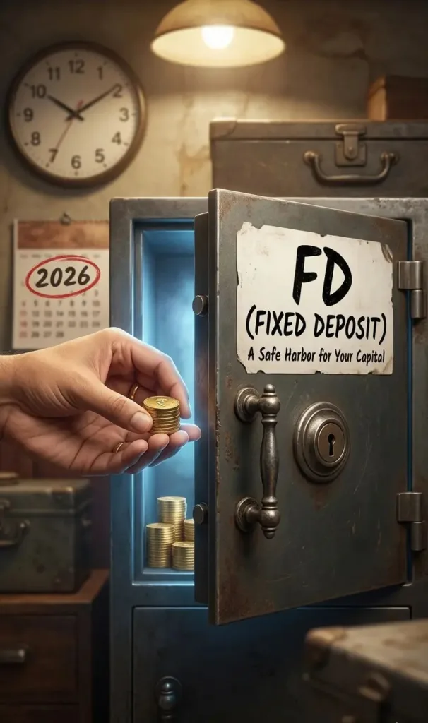 1. FD (सुरक्षित विकल्प): यह जमीन के पास वाली सीढ़ी है। यहाँ गिरने का डर नहीं है, लेकिन आप ऊंचाई पर भी नहीं पहुँच सकते। यह आपकी ‘Capital Preservation’ (पूंजी बचाना) के लिए है।
