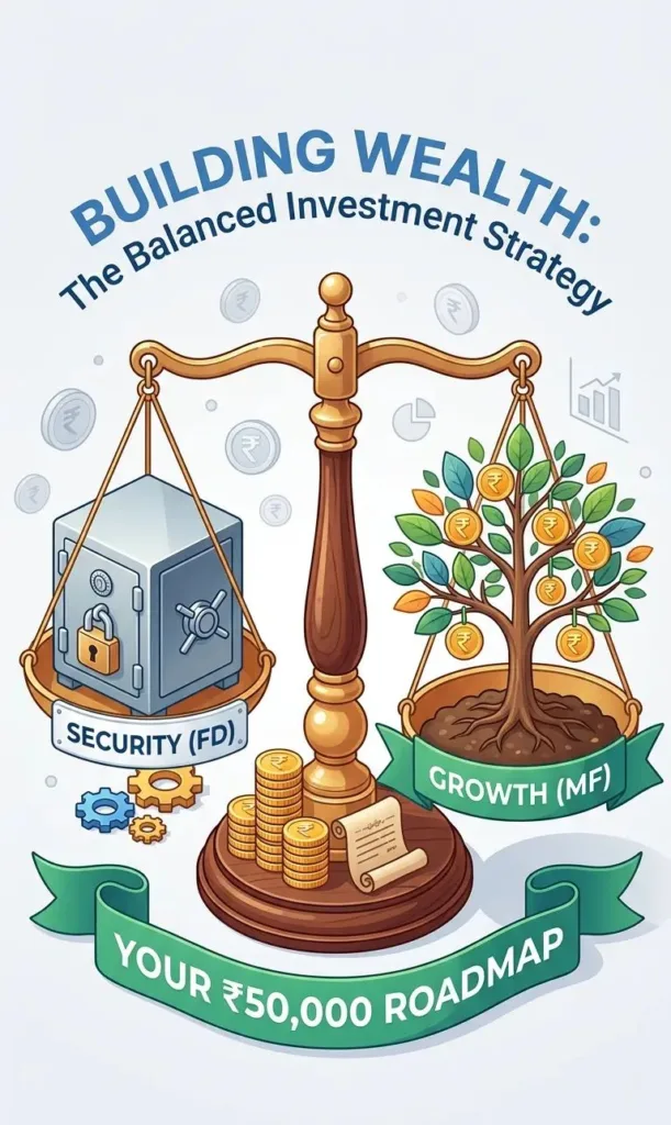 • 50% पैसा FD में (₹25,000): यह आपकी ‘सुरक्षा’ (Security) के लिए है। अगर कल को मार्केट गिरता है या आपको अचानक पैसों की जरूरत पड़ती है, तो यह हिस्सा आपको मजबूती देगा।