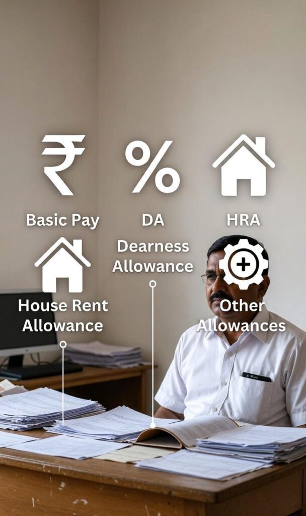 एक Government employee की कुल income सिर्फ basic pay नहीं होती। इसमें कई elements शामिल होते हैं: