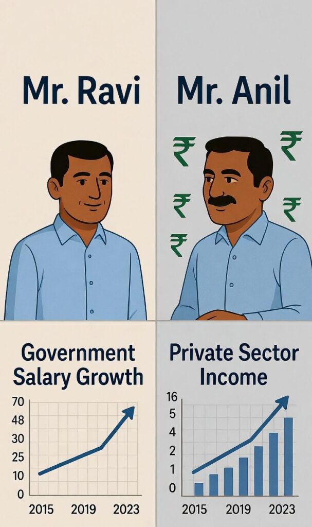 एक उदाहरण के तौर पर, यदि कोई Private employee ₹30,000 से शुरू करके ₹1,20,000 तक पहुँचता है, तो Compounding effect उसके पक्ष में जा सकता है, भले ही एक Government employee की Salary ₹60,000 पर स्थिर रही हो। लेकिन यदि उच्च आय वाला व्यक्ति बचत नहीं करता, तो उस बढ़ी हुई Income का कोई फायदा नहीं मिलता।